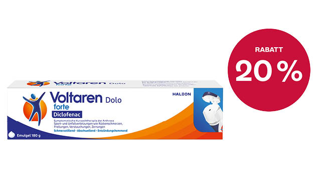 Jetzt 20 % Rabatt beim Kauf von Voltaren Dolo forte Emulgel oder Voltaren Dolo Patch.